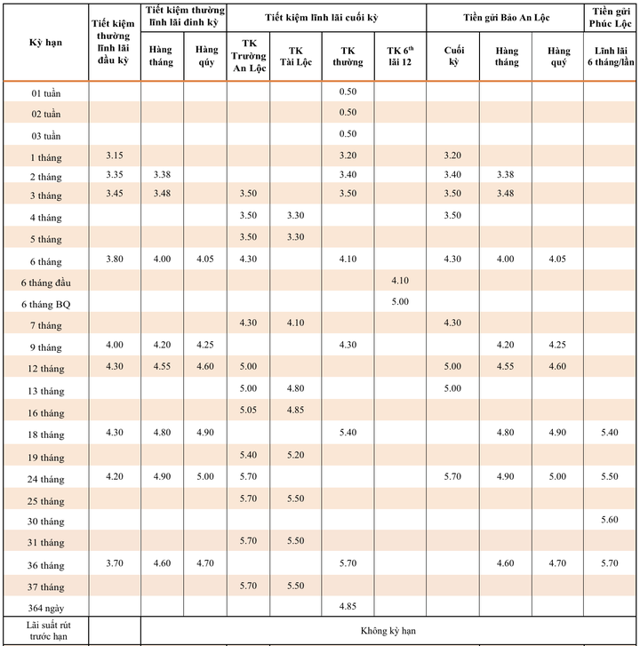 Theo đó, khách hàng gửi tiết kiệm thông thường với các kỳ hạn 1 tháng đến 36 tháng sẽ nhận được lãi suất trong khoảng 3,2 – 5,7%/năm, hình thức lĩnh lãi cuối kỳ.