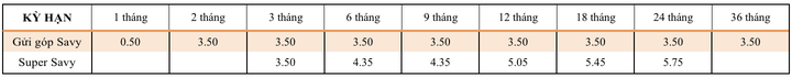 Trong tháng 6 này, biểu lãi suất tiết kiệm của hình thức Super Savy tại ngân hàng TPBank cũng được điều chỉnh tăng 0,1 - 0,5 điểm phần trăm cho các kỳ hạn 3 tháng đến 12 tháng. Do đó, khung lãi suất huy động cho các khoản tiền gửi tại gói Super Savy, kỳ hạn từ 3 tháng đến 24 tháng đang niêm yết trong khoảng 3,5 – 5,75%/năm.