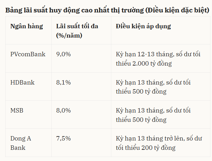 Ở phân khúc dành cho khách hàng cá nhân thông thường không yêu cầu số dư lớn, mặt bằng lãi suất trên 6,5%/năm vẫn đang được duy trì ổn định. Các ngân hàng như Vikki Bank, Bac A Bank, OCB, VIB và PGBank hiện phổ biến áp dụng mức từ 6,5% đến 7%/năm cho các kỳ hạn dài.