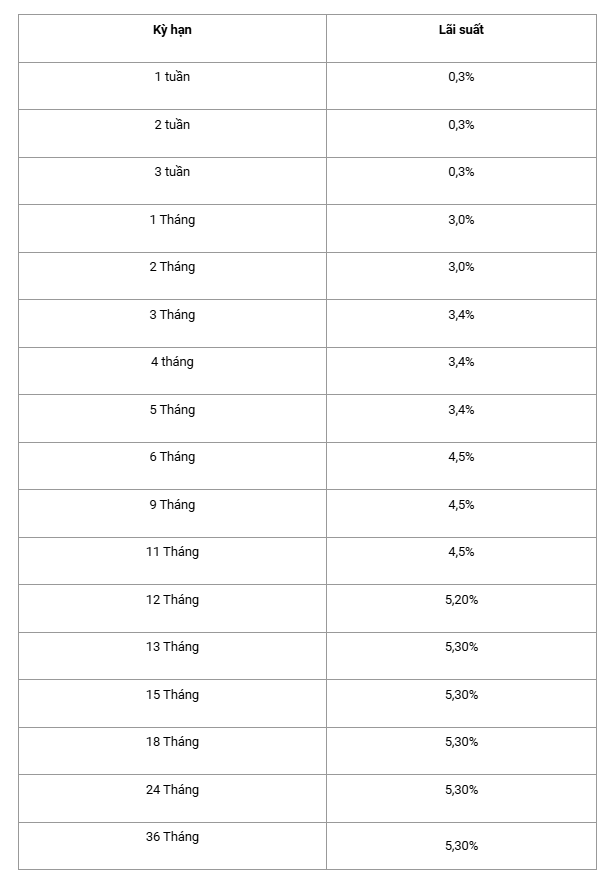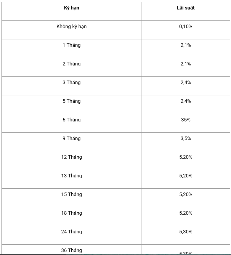 Ở nhóm kỳ hạn từ 6 đến 11 tháng, lãi suất tiền gửi online đang ở mức 4,5%/năm. Với kỳ hạn 12 tháng, lãi suất được niêm yết 5,2%/năm. Các kỳ hạn từ 13 tháng trở lên, bao gồm 24 tháng và 36 tháng, tiếp tục duy trì mức lãi suất cao nhất là 5,3%/năm.