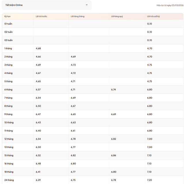 Lãi suất tiết kiệm online tháng 3/2026