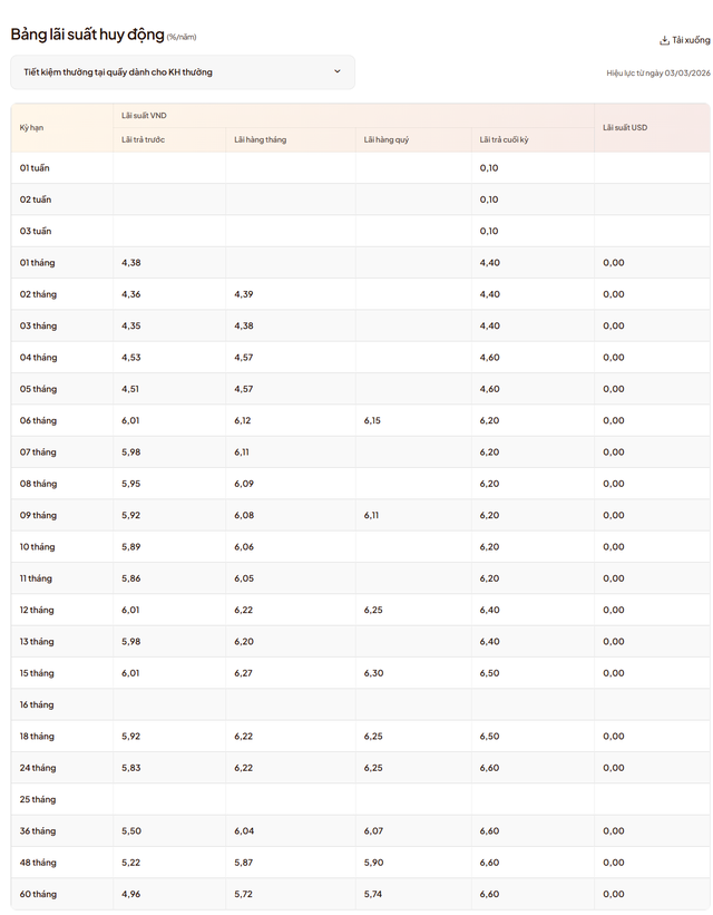 Đáng chú ý, mức lãi suất cao nhất tại quầy hiện đạt 6,6%/năm, áp dụng cho các khoản tiền gửi từ 24 tháng trở lên và duy trì xuyên suốt các kỳ hạn dài đến 60 tháng.