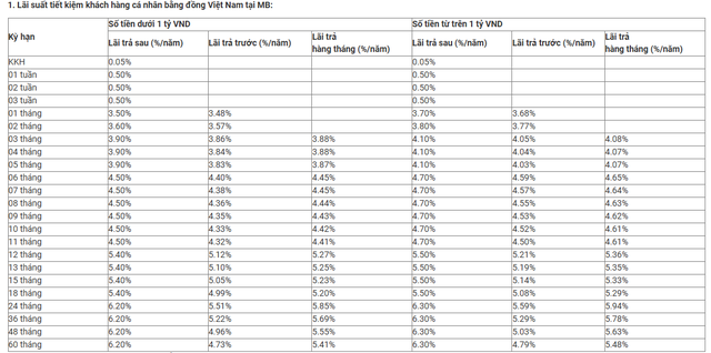 Ở các kỳ hạn dài hơn, lãi suất tiền gửi 6–11 tháng được MB niêm yết ở mức 4,6%/năm. Kỳ hạn 12–18 tháng ghi nhận lãi suất 5,5%/năm. Đáng chú ý, các kỳ hạn dài từ 24 tháng đến 60 tháng được áp dụng mức 6,3%/năm, đây là mức lãi suất cao nhất đối với nhóm tiền gửi dưới 1 tỷ đồng tại khu vực này.
