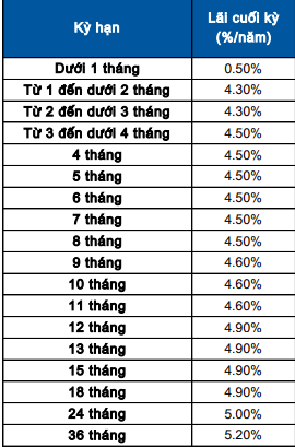 Các kỳ hạn từ 9 đến 11 tháng đang được áp dụng mức 4,6%/năm, trong khi kỳ hạn 12–18 tháng ghi nhận mức 4,9%/năm.