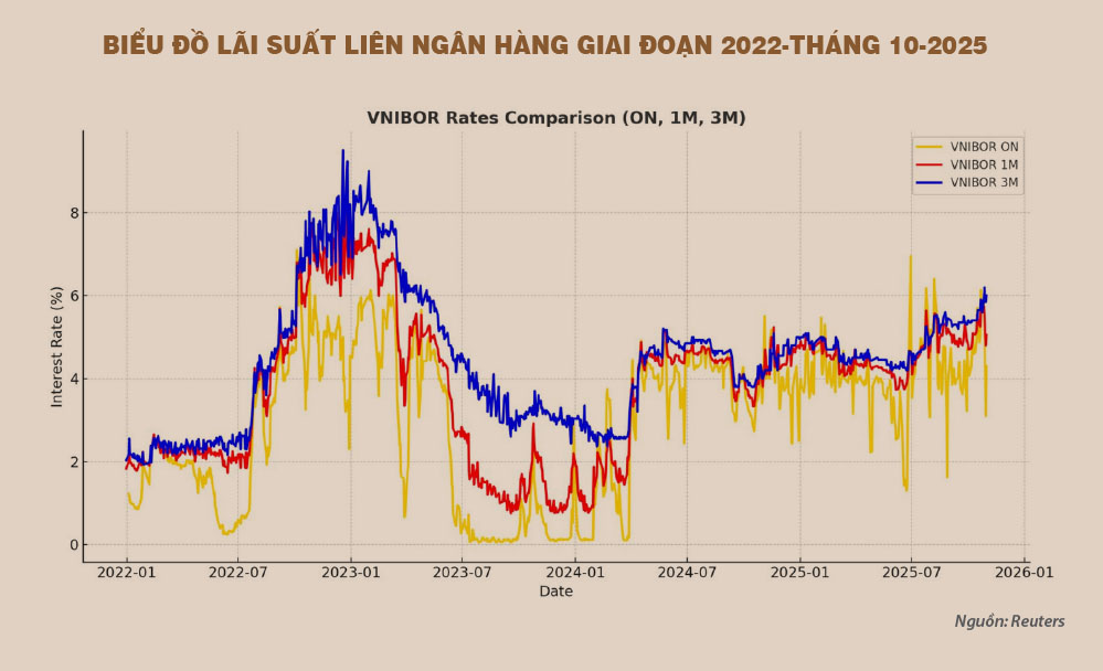 Để so sánh và đánh giá về tính bất ổn, chúng ta có thể tham chiếu lãi suất trên thị trường liên ngân hàng (LNH) trong hai giai đoạn năm 2022, gắn liền với bất ổn thị trường tài chính Việt Nam và giai đoạn hiện tại - năm 2025 (xem biểu đồ).