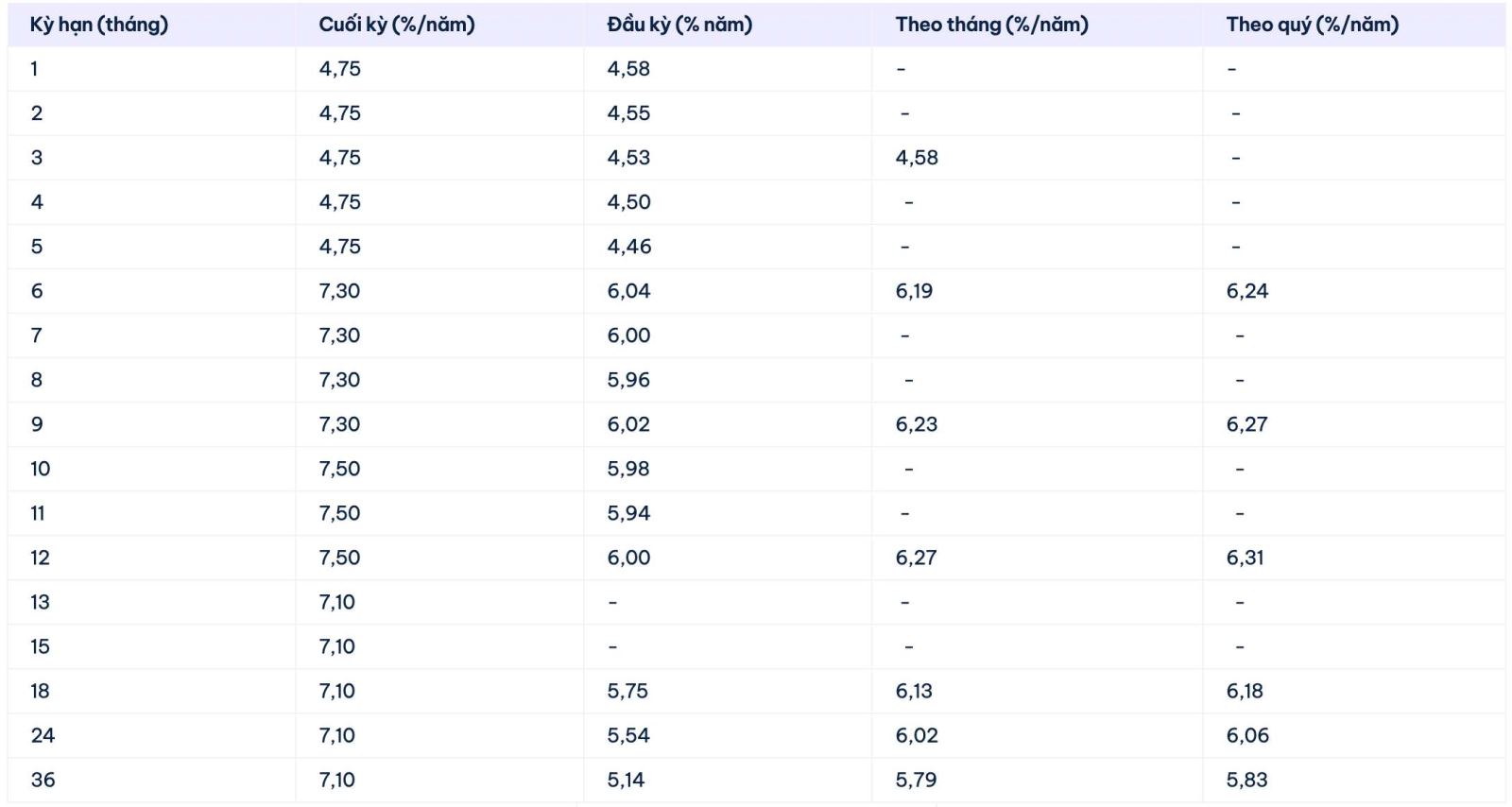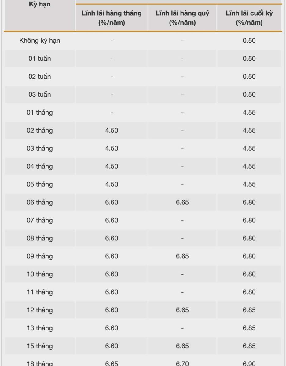 * Thông tin về lãi suất chỉ mang tính chất tham khảo và có thể thay đổi trong từng thời kỳ. Vui lòng liên hệ điểm giao dịch ngân hàng gần nhất hoặc hotline để được tư vấn cụ thể.