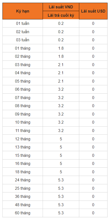 Tương tự, các kỳ hạn 6 tháng đến 11 tháng cũng được ấn định lãi suất ở cùng mức là 3,2%/năm; kỳ hạn 12 -18 tháng là 5%/năm.
