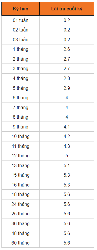 Cao nhất vẫn là kỳ hạn từ 24 đến 60 tháng được ngân hàng niêm yết ở mức 5,3%/năm.