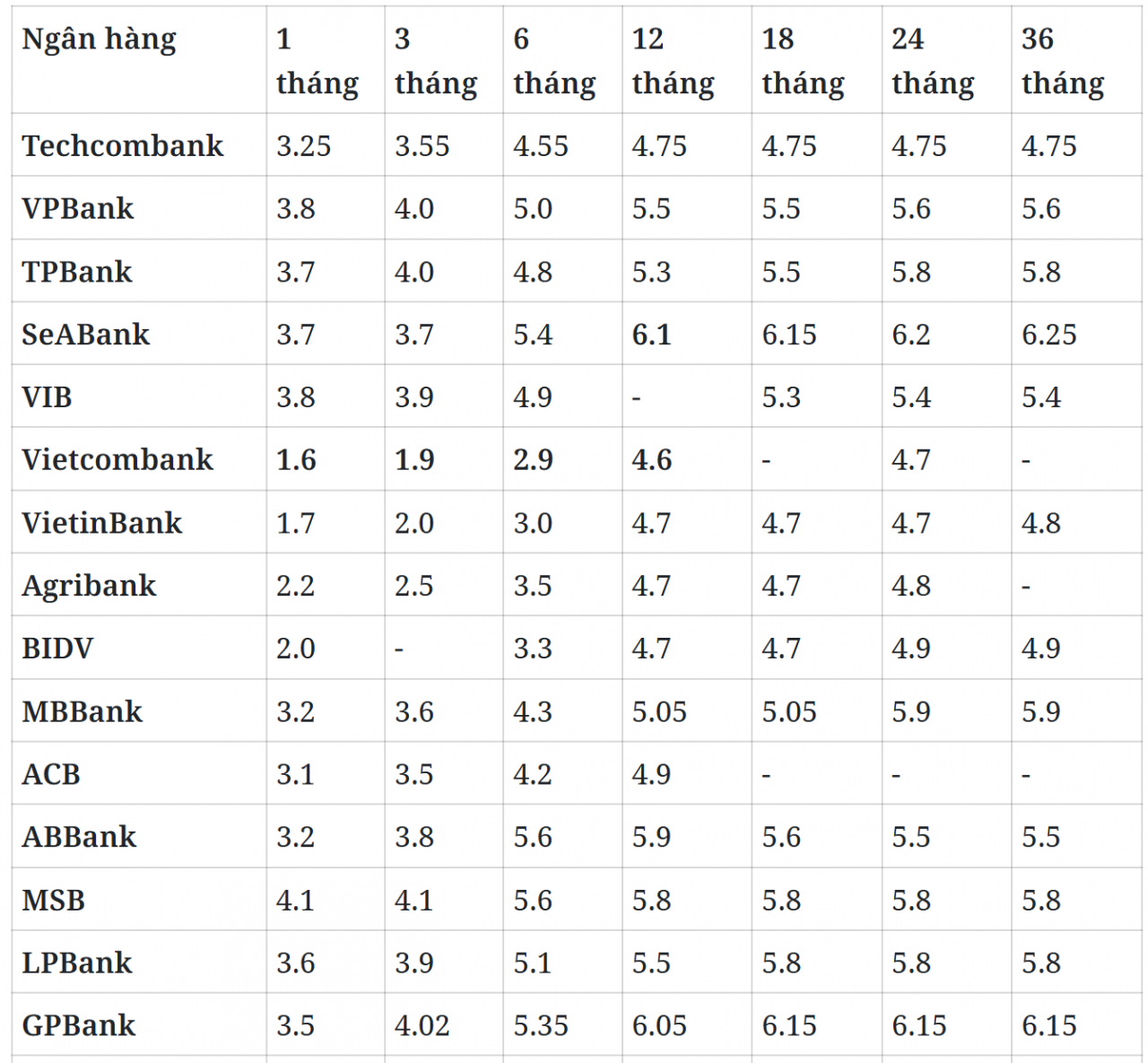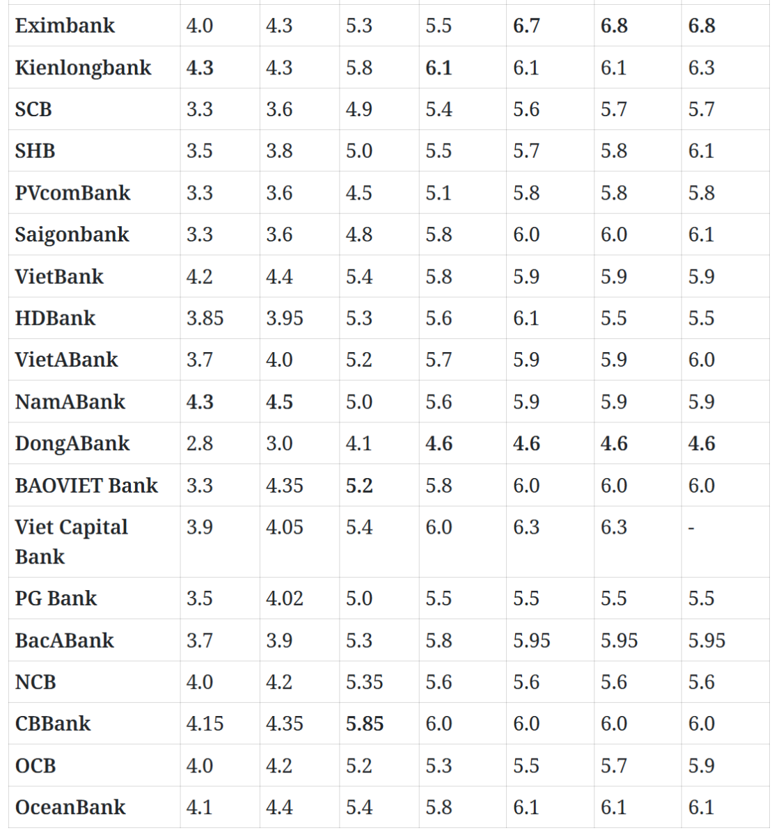 Vikki Bank áp dụng lãi suất 7,5%/năm cho tiền gửi kỳ hạn từ 13 tháng trở lên, với số tiền tối thiểu 999 tỷ đồng; Bac A Bank đang niêm yết mức lãi suất cao nhất 6,2% với kỳ hạn 18 - 36 tháng đối với khoản tiền gửi trên 1 tỷ đồng; IVB áp dụng mức lãi suất 6,15% đối với kỳ hạn 36 tháng, điều kiện áp dụng cho khoản tiền gửi từ 1.500 tỷ đồng trở lên.