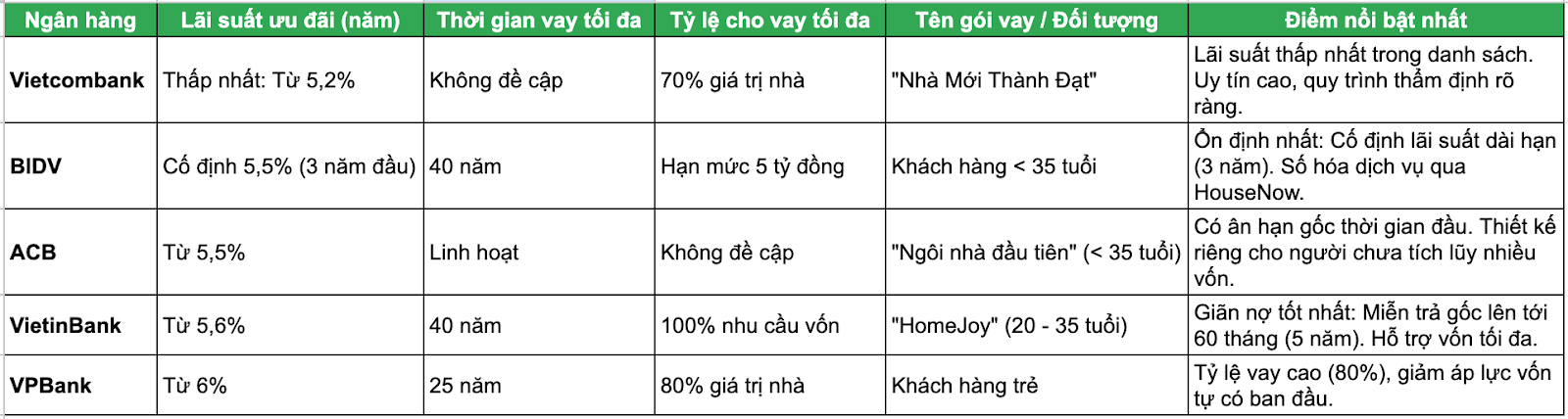 Để giúp người mua nhà có cái nhìn toàn diện và dễ dàng so sánh, dưới đây là bảng tổng hợp các gói vay nổi bật nhất hiện nay: