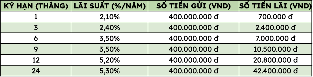 Gửi 400 triệu đồng tại VietinBank nhận lãi bao nhiêu tại các kỳ hạn?