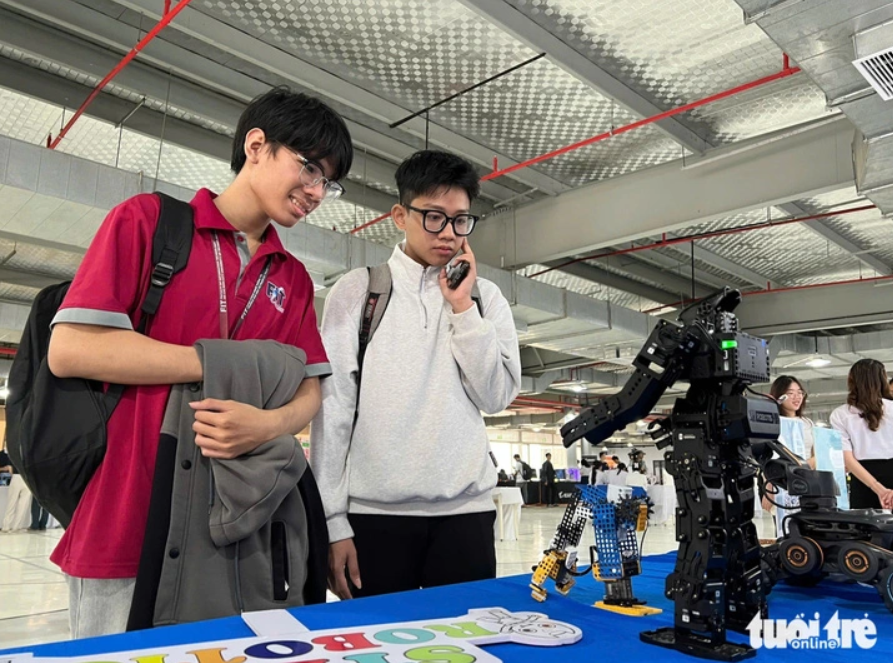 Ảnh chụp sinh viên TP.HCM tham quan mô hình robot có tích hợp trí tuệ nhân tạo AI tại Ngày Sinh viên TP.HCM sáng tạo năm 2025 - Ảnh: TRIỆU VÂN