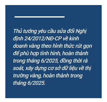 Thủ tướng yêu cầu sửa đổi Nghị định 24/2012/NĐ-CP về kinh doanh vàng theo hình thức rút gọn để phù hợp tình hình, hoàn thành trong tháng 6/2025, đồng thời rà soát, xây dựng cơ sở dữ liệu về thị trường vàng, hoàn thành trong tháng 6/2025.
