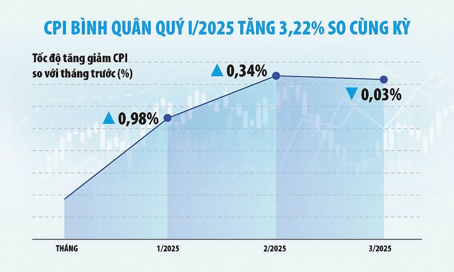 Theo số liệu của Cục Thống kê (Bộ Tài chính), CPI so với tháng trước: Tháng 1/2025 tăng 0,98%, tháng 2/2025 tăng 0,34%, tháng 3/2025 giảm 0,03%. CPI bình quân quý I/2025 tăng 3,22% so cùng kỳ năm trước, vẫn nằm trong các kịch bản lạm phát để kiểm soát chỉ số CPI cả năm 2025 theo mục tiêu Quốc hội đề ra với dư địa lạm phát còn lại mỗi tháng so tháng trước tăng khoảng 0,44% - 0,57% trong 9 tháng còn lại của năm 2025.