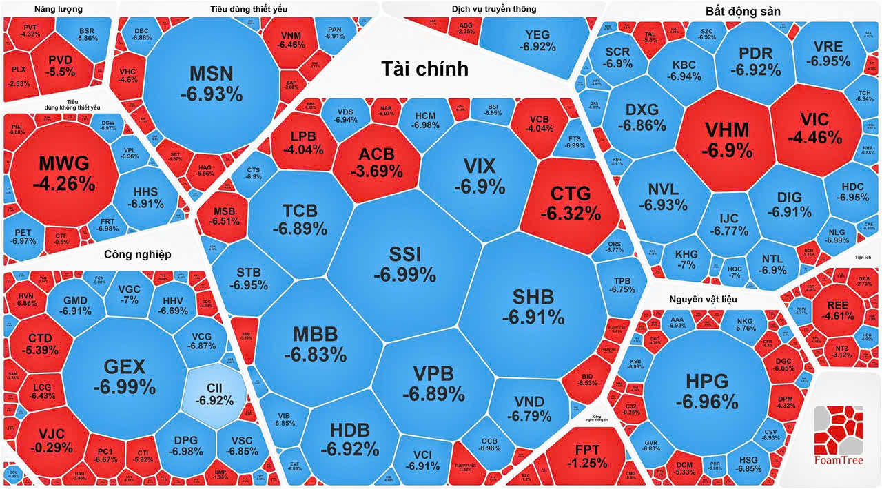 Thanh khoản trên thị trường tăng đột biến với giá trị giao dịch trên sàn HOSE vượt 53.000 tỉ đồng. Áp lực bán tháo diễn ra trên diện rộng, đặc biệt trong nhóm vốn hóa lớn, khiến VN30 rơi hơn 106 điểm, chỉ còn 1.870 điểm.
