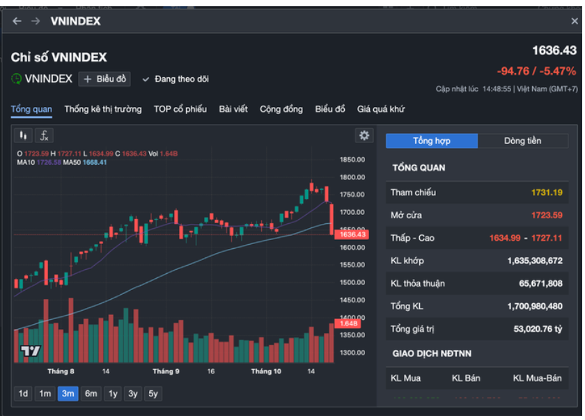 VN-Index gây bất ngờ trong phiên giao dịch ngày 20-10 khi đóng cửa ở mức 1.636 điểm, mất gần 95 điểm (5,47%). HNX Index cũng giảm hơn 13 điểm (4,74%) còn 263 điểm.