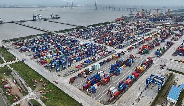 Quang cảnh cảng hàng hóa tại tỉnh Giang Tô, Trung Quốc. (Nguồn: THX/TTXVN)