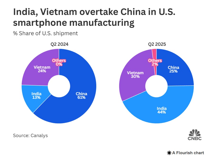 Ấn Độ và Việt Nam vượt Trung Quốc về xuất khẩu điện thoại thông minh sang Mỹ. Nguồn: CNBC