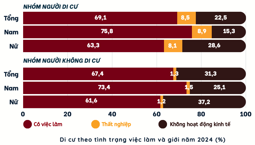 Dữ liệu 2024 cho thấy lao động di cư có tỉ lệ có việc làm cao hơn người không di cư, đặc biệt ở nam giới. Tỉ lệ người có việc làm trong nhóm người di cư đạt 69,1%, cao hơn so với người không di cư là 67,4%.