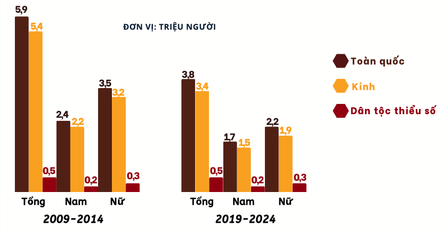 Cụ thể, giai đoạn 2009-2014 tổng số người di cư nội địa ở Việt Nam là 5,9 triệu người; Giai đoạn 2014-2019 được coi là giai đoạn bùng nổ với quy mô số người di cư đạt ngưỡng đỉnh là 6,4 triệu người. Tuy nhiên đến giai đoạn 5 năm trở lại đây, từ 2019-2024 tổng số người di cư giảm chỉ còn 3,8 triệu người.