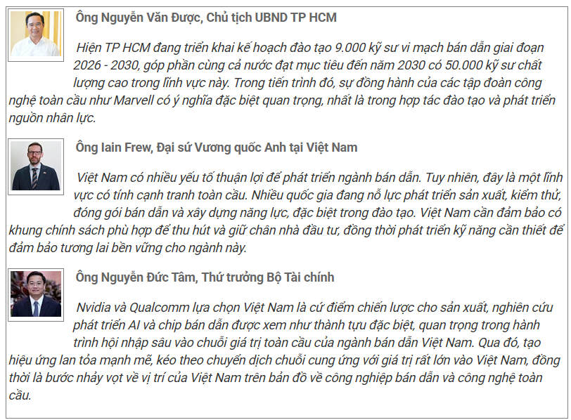 "Các khung pháp lý về bảo vệ sở hữu trí tuệ và các thỏa thuận chuyển giao công nghệ với những tập đoàn hàng đầu đóng vai trò then chốt không kém. Thúc đẩy hợp tác giữa các doanh nghiệp Việt Nam như Viettel hay FPT với các tập đoàn bán dẫn hàng đầu thế giới là yếu tố quyết định để thúc đẩy chuyển giao tri thức và tiến bộ công nghệ", ông cho biết.