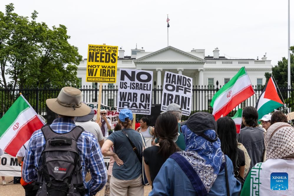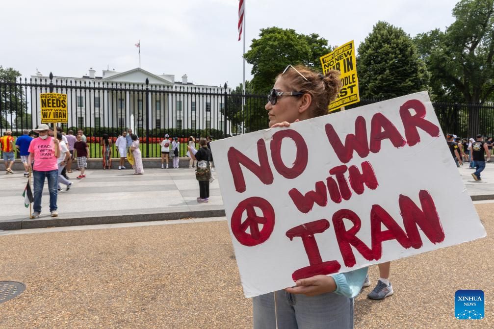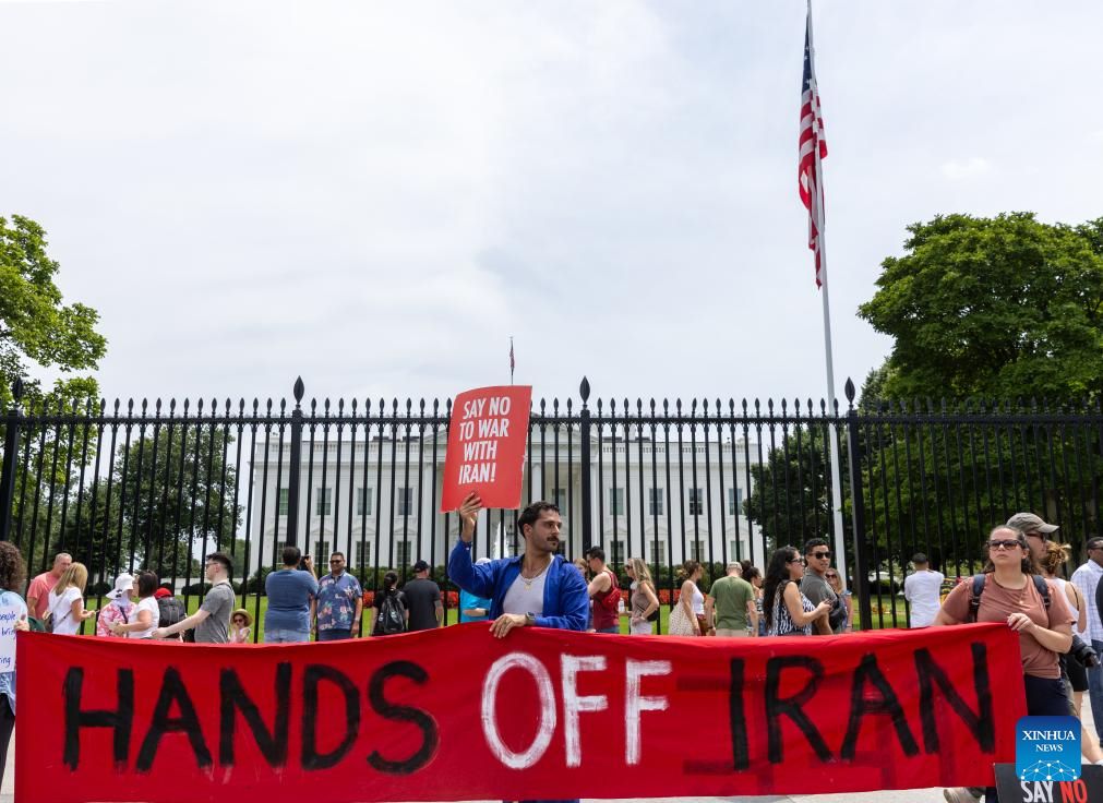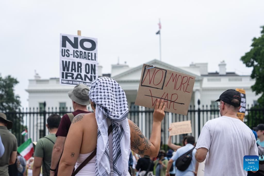 Người biểu tình tập trung bên ngoài Nhà Trắng để phản đối các cuộc không kích của Mỹ vào các cơ sở hạt nhân của Iran, tại Washington, D.C., ngày 22.6.2025. Ảnh: Xinhua