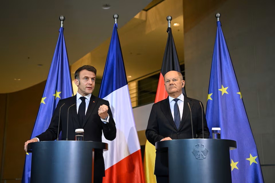 Tổng thống Pháp Emmanuel Macron và Thủ tướng Đức Olaf Scholz phát biểu với giới truyền thông sau cuộc hội đàm tại Berlin, Đức, ngày 18/3. Ảnh: Reuters