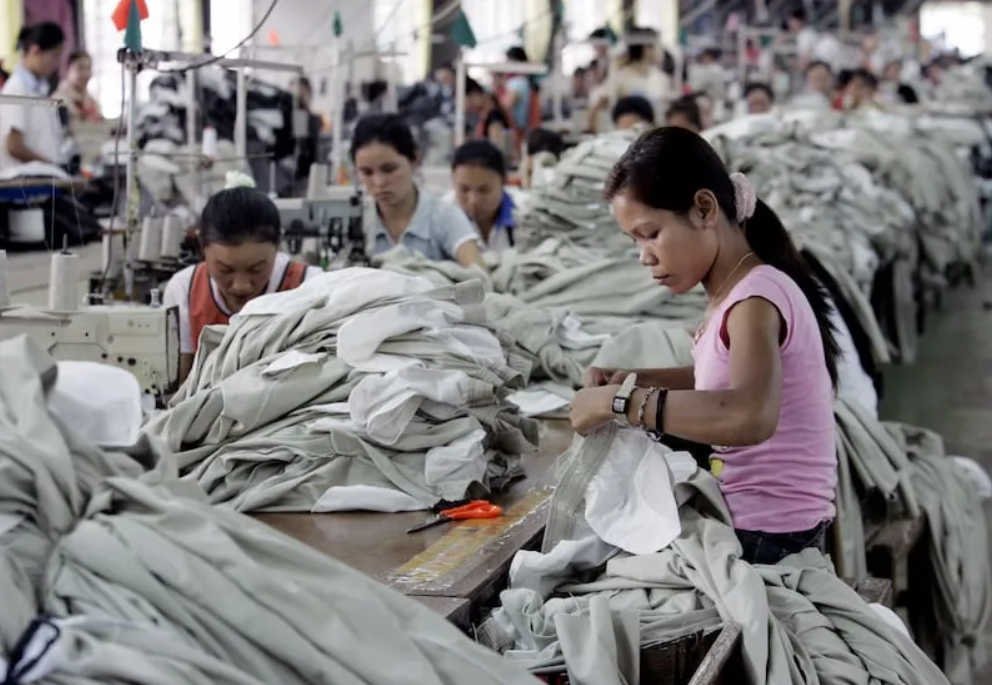 Công nhân nhà máy lắp ráp hàng may mặc để xuất khẩu ra nước ngoài ở ngoại ô thủ đô Viêng Chăn của Lào ngày 2/5/2006. Giá cả tăng và tiền lương thực tế giảm đang thúc đẩy nhiều người ra nước ngoài làm việc.