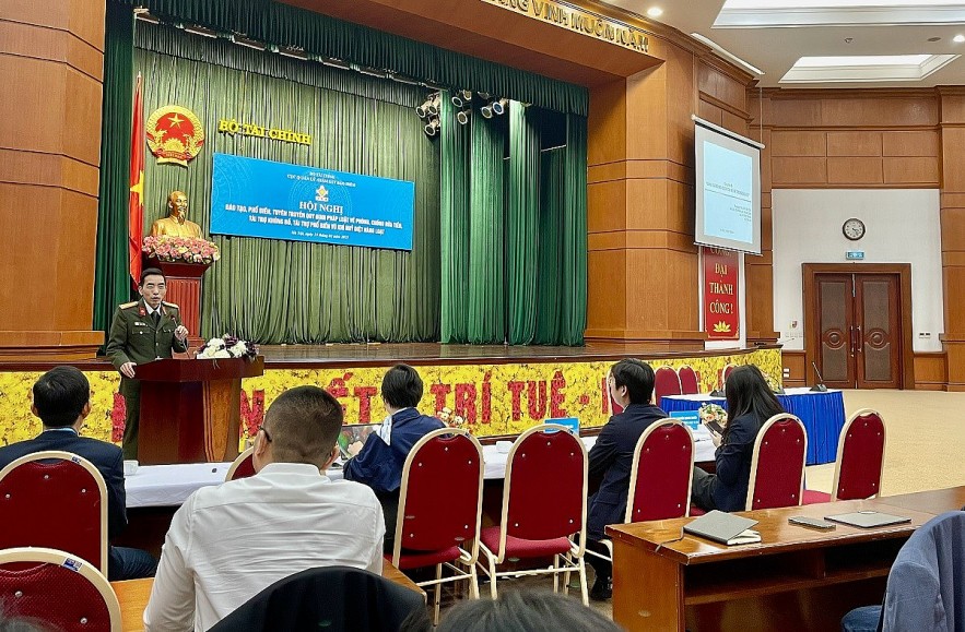 Đại diện Bộ Công an chia về nội dung phòng, chống tài trợ khủng bố, tài trợ phổ biến vũ khí hủy diệt hàng loạt. Ảnh: Ánh Tuyết.