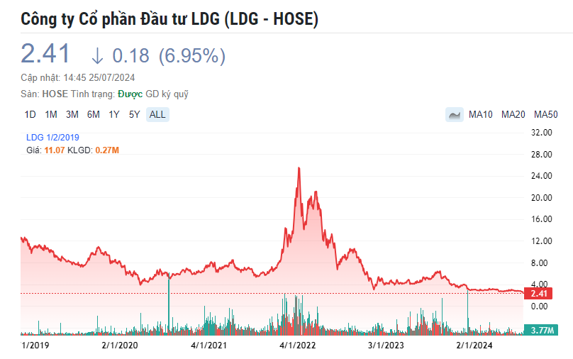 Trên thị trường chứng khoán, LDG mang đến nhiều “nỗi đau” với nhiều chứng sỹ. Sau 9 năm niêm yết, thị giá LDG chia 3 lần từ mức giá 7.520 đồng/cp (giá điều chỉnh) về mức giá 2.410 đồng/cp - mức đáy lịch sử như hiện nay. Thanh khoản giao dịch ngày càng “teo tóp”, chỉ bằng 1/10 so với thời điểm 1 năm trước.
