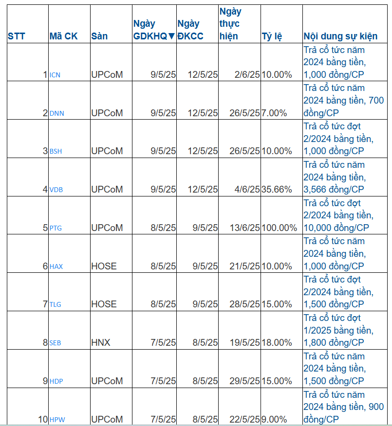 Trong tuần tới từ ngày 5-9/5 có 18 doanh nghiệp chốt quyền trả cổ tức bằng tiền, trong đó CTCP May Xuất khẩu Phan Thiết (mã chứng khoán PTG) trả cổ tức cao nhất là 100% (1 cổ phiếu được nhận 10.000 đồng); tiếp đến là CTCP Vận tải và Chế biến Than Đông Bắc (mã chứng khoán VDB) trả cổ tức 35,66% (1 cổ phiếu được nhận 3.566 đồng).