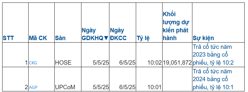 Ngoài ra, cũng trong thời gian này, cũng có 2 doanh nghiệp chốt quyền trả cổ tức bằng cổ phiếu. Dưới đây là danh sách doanh nghiệp sẽ chốt quyền chia cổ tức bằng cổ phiếu tuần tới: