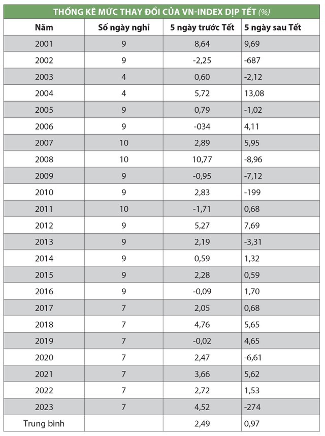 Thị trường chứng khoán Việt Nam đã có 24 năm hoạt động và trải qua 23 kỳ Tết Nguyên đán, trong đó có 17 lần VN-Index tăng trong 5 ngày trước Tết và 13 lần chỉ số tăng trong 5 ngày đầu Xuân.