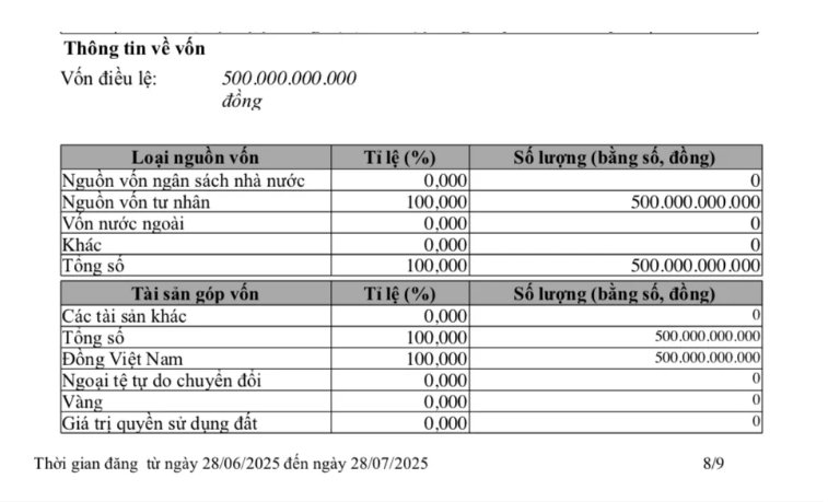 Tại ngày cấp đăng ký thay đổi 27/6/2025, công ty có màn nâng vốn ấn tượng lên 500 tỷ đồng. Ngành nghề kinh doanh chính là xây dựng công trình kỹ thuật dân dụng khác.