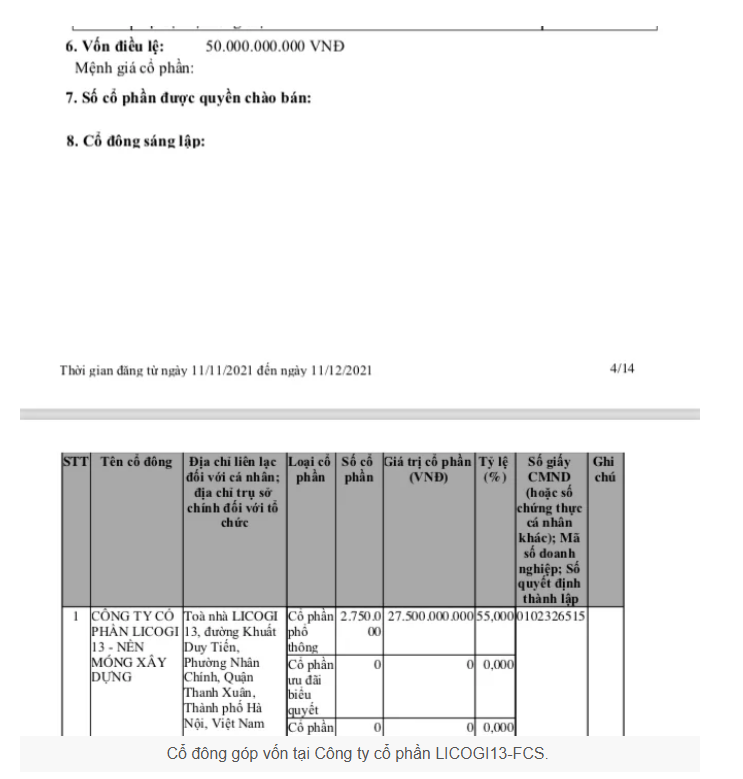 Còn theo thông tin giới thiệu trên Cổng thông tin quốc gia về đăng ký doanh nghiệp, Công ty cổ phần LICOGI13-FCS được thành lập ngày 11/11/2021, ngành nghề kinh doanh chính là xây dựng công trình kỹ thuật dân dụng khác.