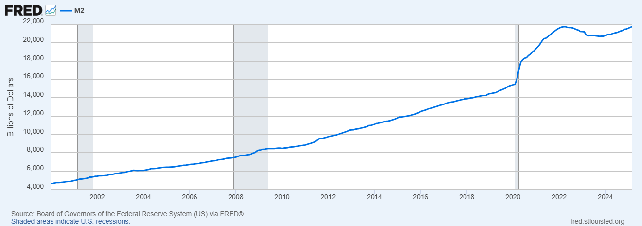 Nguồn cung tiền đô-la Mỹ tăng 500% trong 25 năm qua - Nguồn: FRED