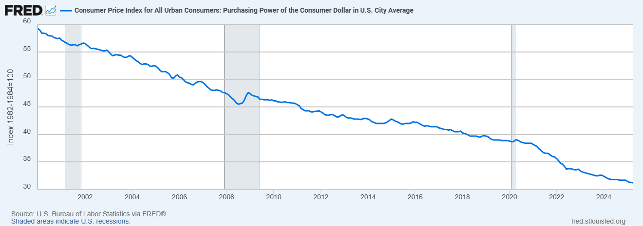Sức mua của 1 đồng đô-la giảm 50% trong 25 năm qua - Nguồn: FRED