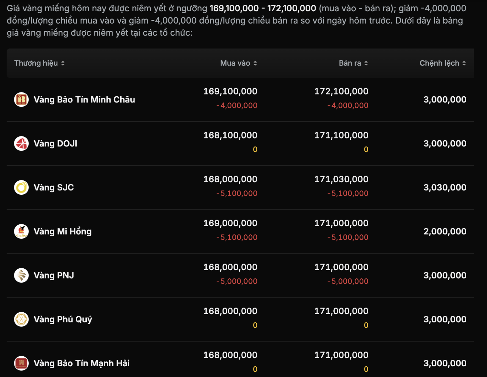 Giữa bối cảnh thị trường hoảng loạn, Công ty Vàng bạc đá quý Mi Hồng trở thành điểm sáng hiếm hoi về thanh khoản khi niêm yết giá mua vào ở mức 169,0 triệu đồng/lượng và bán ra 171,0 triệu đồng/lượng. Việc thu hẹp biên độ mua - bán xuống còn 2 triệu đồng/lượng tại đơn vị này phần nào hỗ trợ tốt hơn cho người dân có nhu cầu cắt lỗ.