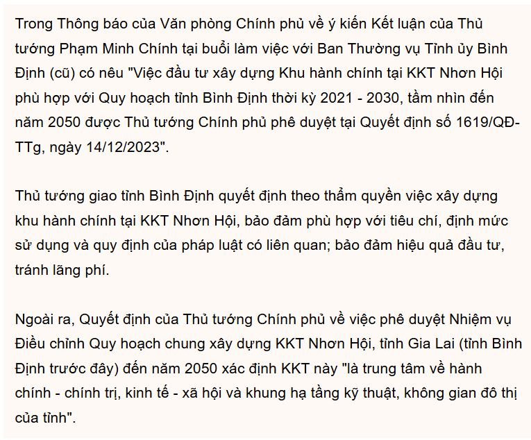 Tuy nhiên, khu đất này trước đây đã giao cho chủ đầu tư kinh doanh kết cấu hạ tầng KCN Nhơn Hội - Khu C. Do đó, trường hợp triển khai quy hoạch khu trung tâm hành chính tại đây, tỉnh phải thực hiện các thủ tục theo Nghị quyết số 171 của Quốc hội về thí điểm thực hiện dự án nhà ở thương mại thông qua thỏa thuận về nhận quyền sử dụng đất hoặc đang có quyền sử dụng đất.