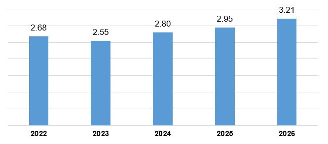 Vốn đầu tư trực tiếp nước ngoài thực hiện 2 tháng đầu năm các năm 2022-2026 (Tỷ USD). Nguồn: Cục Đầu tư nước ngoài (BTC)