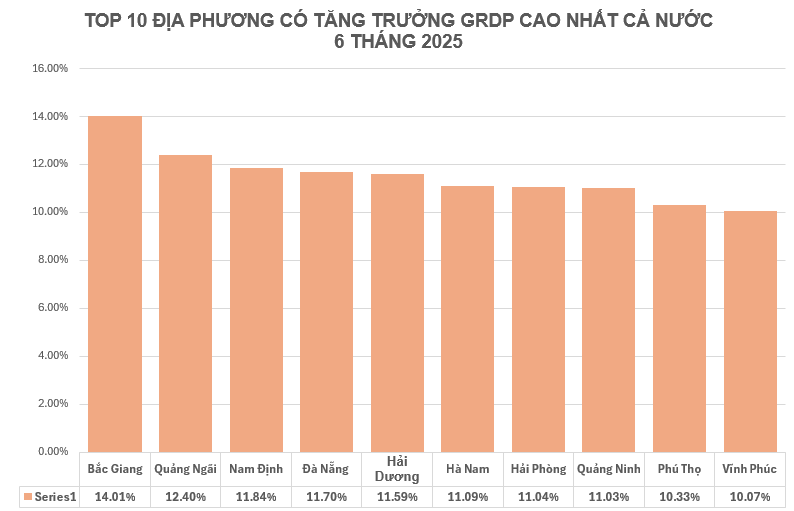 Đặc biệt, các địa phương đầu tàu tăng trưởng đạt kết quả tốt. Tính theo 63 tỉnh, thành phố cũ, TPHCM tăng 7,82%, Hà Nội tăng 7,63% và 10 địa phương tăng trưởng 2 con số. Cụ thể, dẫn đầu là Bắc Giang, với GRDP 6 tháng đầu năm tăng 14,01%.