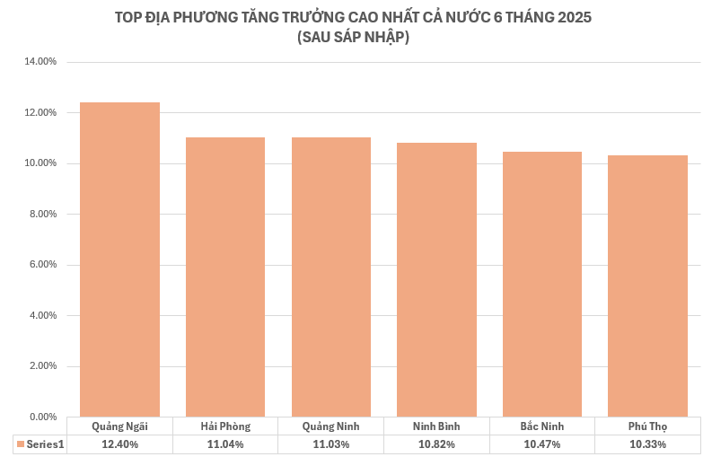Tính theo 34 tỉnh, thành phố mới, có 6 địa phương tăng trưởng 2 con số. Cụ thể, Quảng Ngãi tăng 11,51%, Hải Phòng 11,2%, Quảng Ninh 11,03%, Ninh Bình 10,82%, Bắc Ninh 10,47%, Phú Thọ 10,09%.