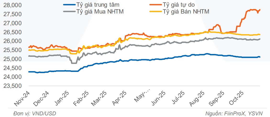Trong tuần trước, tỷ giá trong nước tăng nhẹ dù đồng đô la Mỹ yếu đi, trong bối cảnh lãi suất tiền đồng trên thị trường liên ngân hàng hạ nhiệt. Tỷ giá trung tâm duy trì quanh mức 25.122, gần như đi ngang, trong khi tỷ giá bán tại các ngân hàng thương mại khoảng 26.378, tăng 0,15% tính theo tuần. Còn trên thị trường tự do có giảm nhẹ và biến động không nhiều so với tuần trước đó, sau khi tăng mạnh đến gần mốc 28.000.