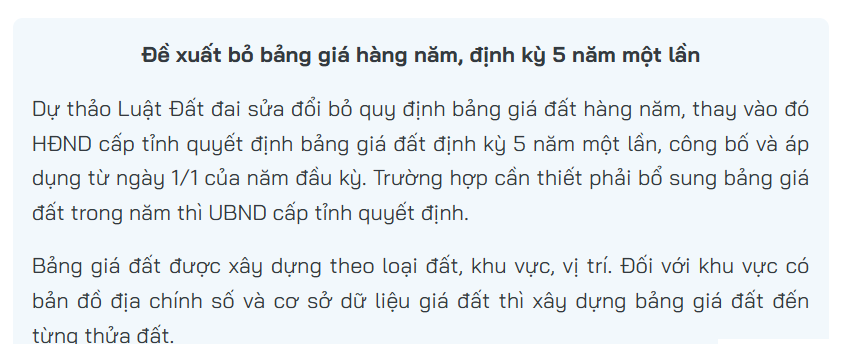 “Chúng ta đang triển khai bảng giá đất ban hành hàng năm, đó là khó khăn cho các cơ quan chính quyền, nên lần sửa Luật Đất đai này điều chỉnh sang ngưỡng 5 năm là phù hợp”, ông Đính nói.