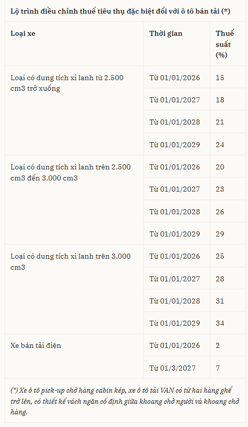 Thuế suất thuế tiêu thụ đặc biệt đối với ô tô bán tải vẫn giữ nguyên mức cũ trong năm 2026 và sẽ bắt đầu điều chỉnh tăng từ năm 2027.