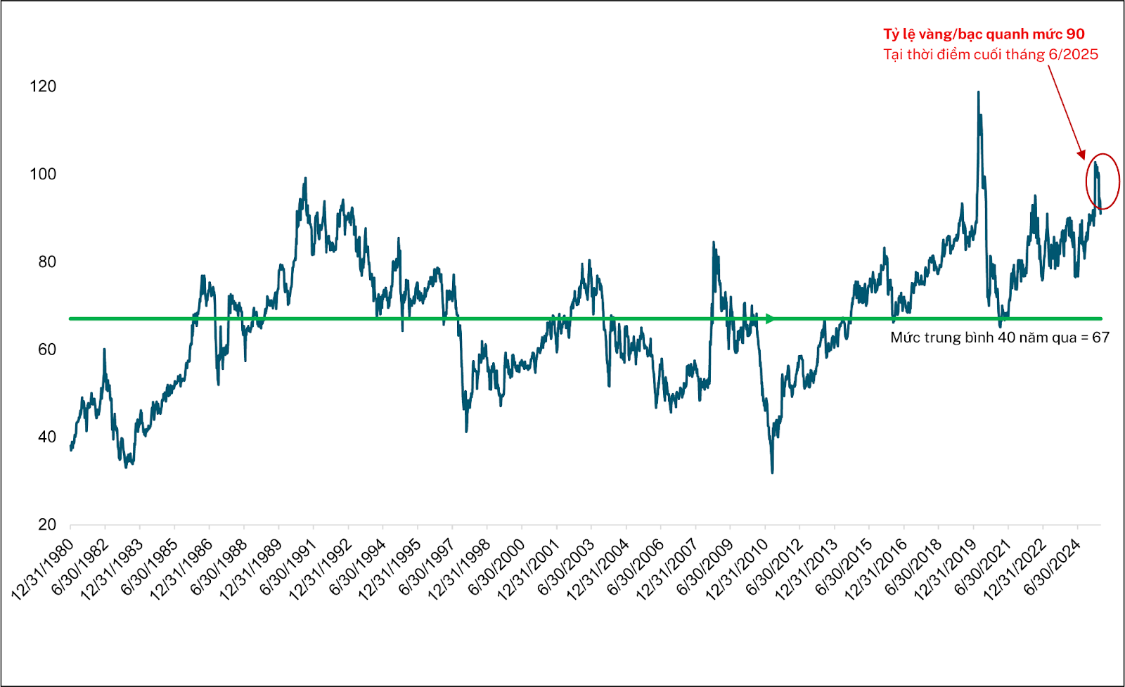 Tỷ lệ giá vàng/giá bạc 40 năm qua.