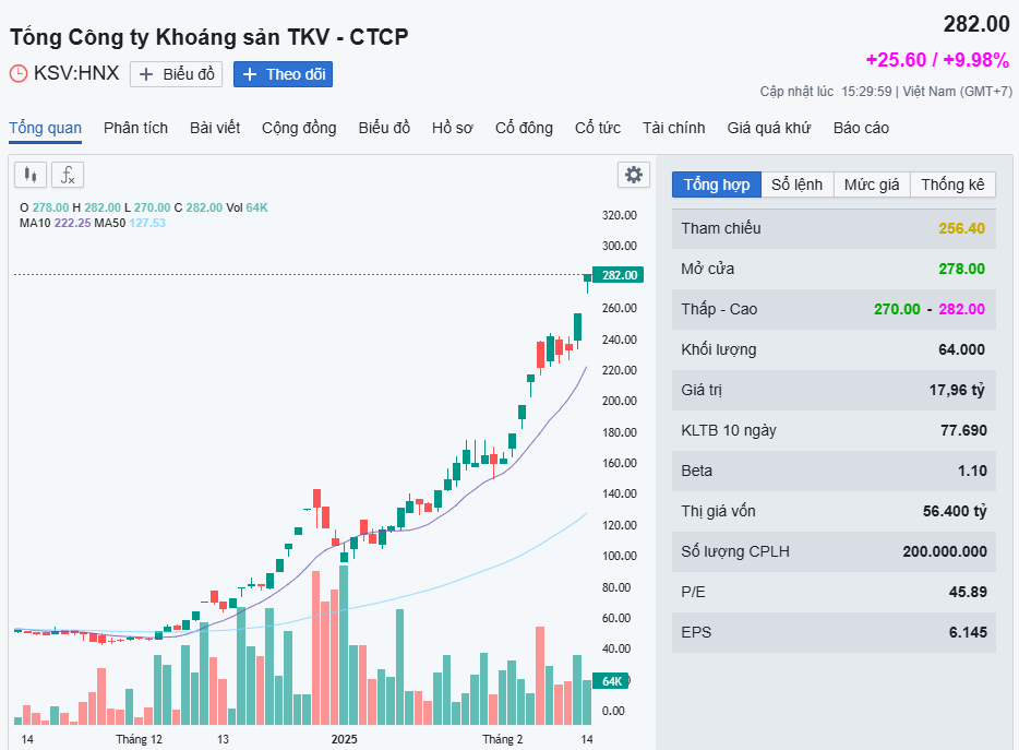 Góp mặt trong top 10 còn có cổ phiếu đã tăng bằng lần trong chưa đầy 3 tháng qua là KSV của Tổng công ty Khoáng sản TKV (Vimico). Trong thời gian này, cổ phiếu KSV đã tăng một mạch từ vùng giá 47.000 đồng lên 282.000 đồng/cổ phiếu.