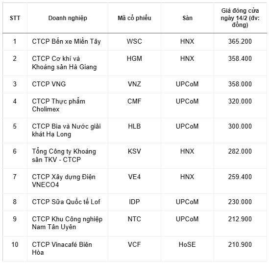 10 cổ phiếu đắt nhất sàn chứng khoán Việt Nam đều có giá trên 200.000 đồng/cổ phiếu tính đến hết phiên 14/2, tất cả cùng thuộc nhóm phi tài chính.