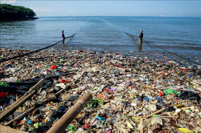 Rác thải nhựa trên bờ biển Sukaraja ở Lampung, Indonesia. Ảnh minh họa: THX/TTXVN
