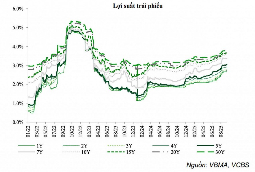 Theo thống kê của Hiệp hội Thị trường trái phiếu Việt Nam, lợi suất các kỳ hạn từ 1 năm đến 30 năm đều tăng trong khoảng 18 - 32 điểm cơ bản so với quý trước. Đường cong lợi suất dịch chuyển lên trên, phản ánh kỳ vọng lãi suất duy trì ở mức cao trong trung hạn. Xu hướng này chủ yếu bắt nguồn từ mặt bằng lãi suất liên ngân hàng tăng và thanh khoản hệ thống chưa thực sự dồi dào.